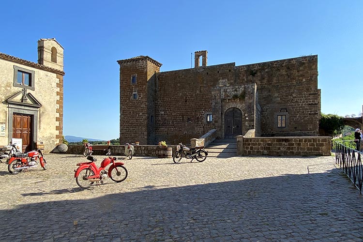 Dopo aver superato la scenografica via del Ponte, si raggiunge la parte architettonicamente più interessante di Celleno Antica, la Piazza del Castello, detta Piazza del Comune. Probabilmente modificata nel XV secolo, questo luogo ha visto il succedersi di epoche e civiltà ed è stata teatro di eventi funesti, come l'uccisione di Giovanni Gatti, ultimo erede della famiglia che governò Celleno, torturato e giustiziato per ordine di Papa Alessandro VI per essersi rifiutato di riconsegnare il feudo alla Chiesa.